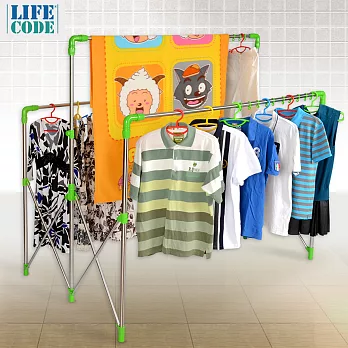 X型折疊不鏽鋼伸縮衣架和曬衣網架兼具使用方便且可摺疊收納,可晾曬棉被、大型衣物和毛線針織冬衣等,適用租屋一族和小家庭。